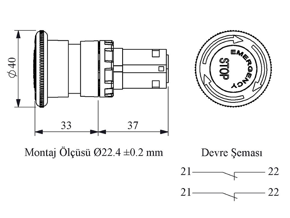 Главная/ Продукция / Кнопки управления / Серии MB, 22 мм, IP50 / Аварийные кнопки "STOP" / Кнопка аварийная моноблочная с маркировкой (2НЗ), MB202EE