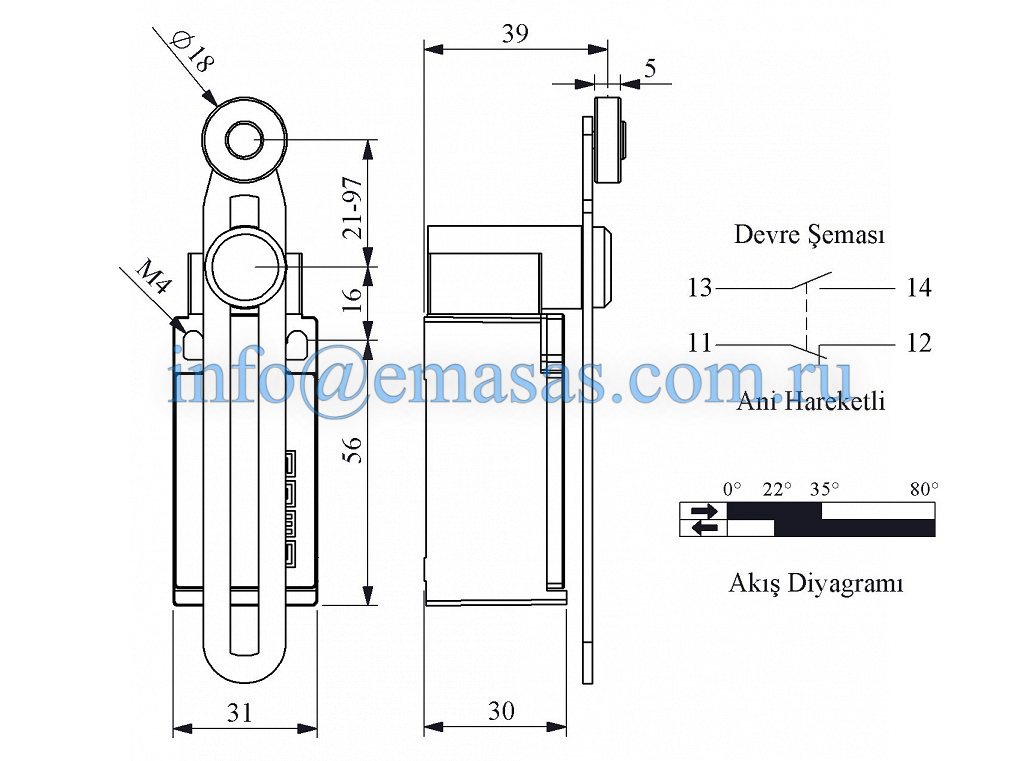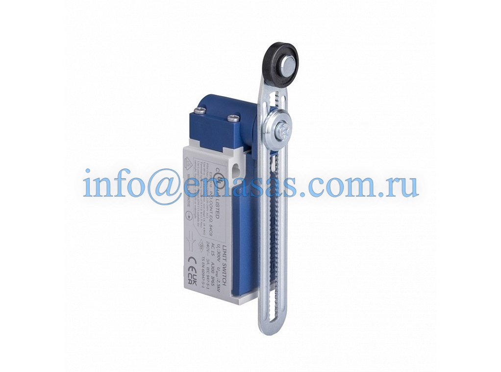 Выключатель концевой быстрого переключения угловой 2-х направленный с металлической консолью и пластиковым роликом Ф18мм на длинном регулируемом рычаге (1НО+1НЗ), L5K13MEP123