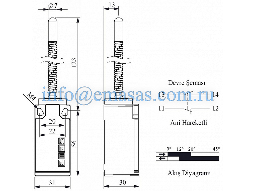 Выключатель концевой быстрого переключения многонаправленный с пластмассовой консолью и стальной пружиной и наконечником (1НО+1НЗ), L5K13SOM102