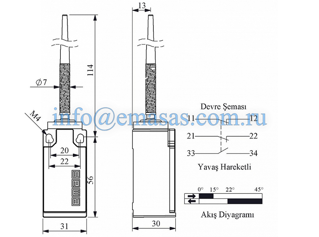 Выключатель концевой синхронного переключения многонаправленный с пластмассовой консолью, стальной пружиной, пластмассовый наконечник-конус (1НО+2НЗ), L5K25SOP101
