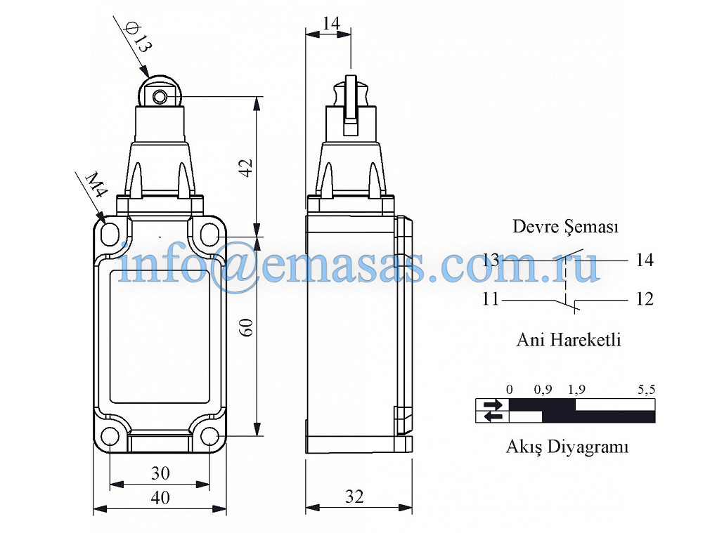 Выключатель концевой быстрого переключения линейный 3-х направленный с металлической консолью, стальным плунжером и роликом Ф13мм (1НО+1НЗ), L52K13MUM331