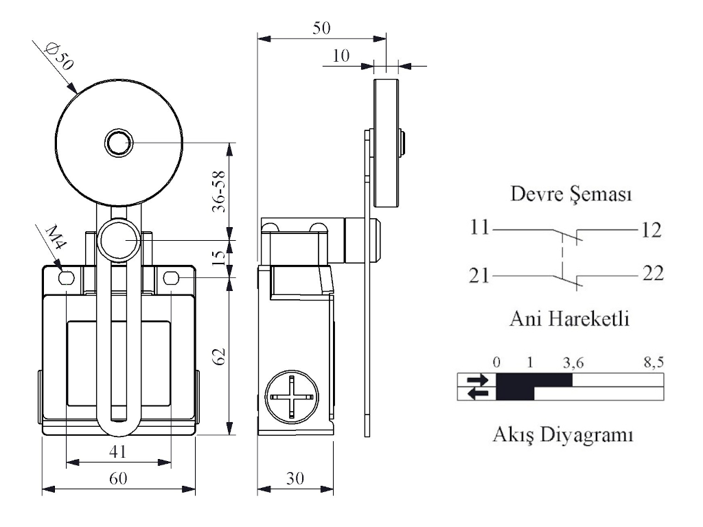 Выключатель концевой быстрого переключения угловой 2-х направленный с металлической консолью и резиновым роликом Ф50мм на длинном регулируемом рычаге (2НЗ), L53K12MEL123