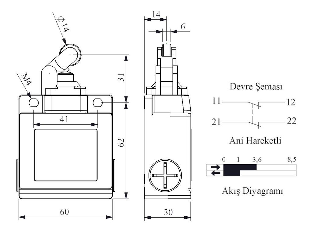 Выключатель концевой быстрого переключения угловой 1-но направленный с металлической консолью и упором с металлическим роликом Ф14 мм (2НЗ), L53K12MIM311
