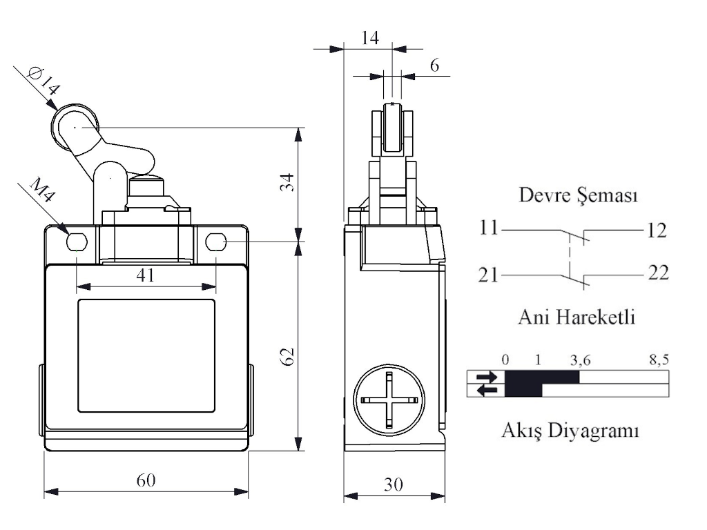 Главная/ Продукция / Концевые выключатели / Серии L53 / Выключатель концевой быстрого переключения угловой 1-но направленный с металлической консолью и упором с пластиковым роликом Ф14мм (2НЗ), L53K12MIP411