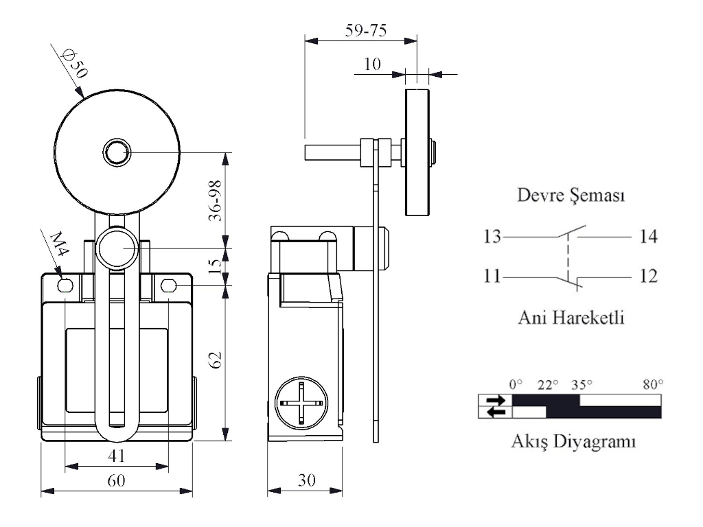 Выключатель концевой быстрого переключения угловой 2-х направленный с металлической консолью и резиновым роликом Ф50мм на длинном регулируемом по наклону рычаге (1НО+1НЗ), L53K13MEL123A