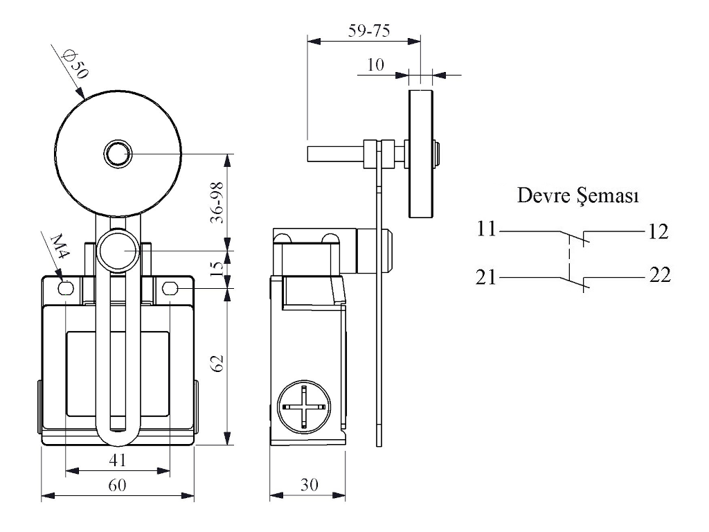 Выключатель концевой синхронного переключения угловой 2-х направленный с металлической консолью и резиновым роликом Ф50мм на длинном регулируемом по наклону рычаге (2НЗ), L53K22MEL123A