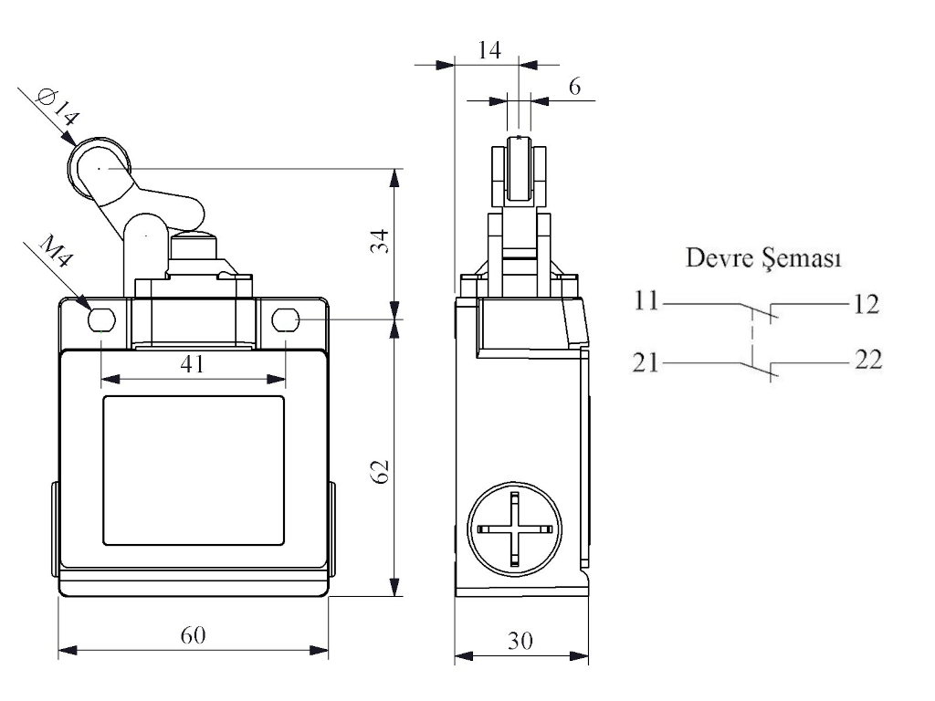 Выключатель концевой синхронного переключения угловой 1-но направленный с металлической консолью и упором с пластиковым роликом Ф14мм (2НЗ), L53K22MIP411