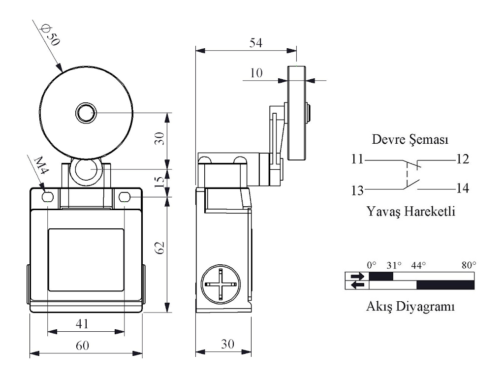 Выключатель концевой синхронного переключения угловой 2-х направленный с металлической консолью и резиновым роликом Ф50мм на коротком не регулируемом рычаге (1НО+1НЗ), L53K23MEL121