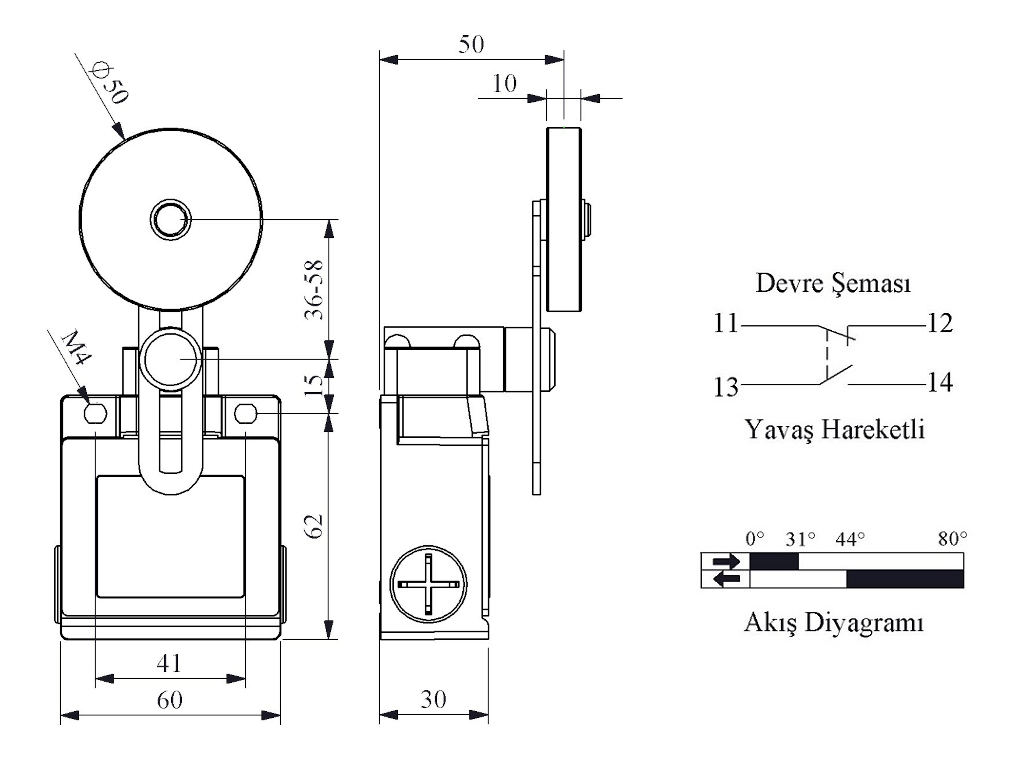 Выключатель концевой синхронного переключения угловой 2-х направленный с металлической консолью и резиновым роликом Ф50мм на коротком регулируемом рычаге (1НО+1НЗ), L53K23MEL122