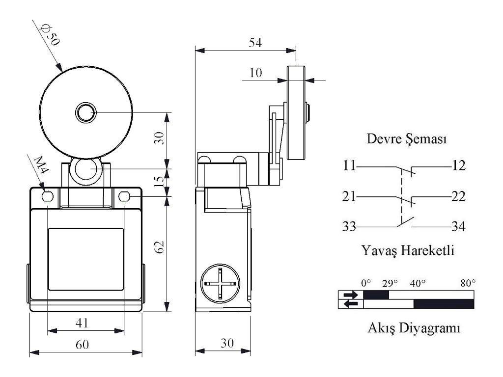 Выключатель концевой синхронного переключения угловой 2-х направленный с металлической консолью и резиновым роликом Ф50мм на коротком не регулируемом рычаге (1НО+2НЗ), L53K25MEL121