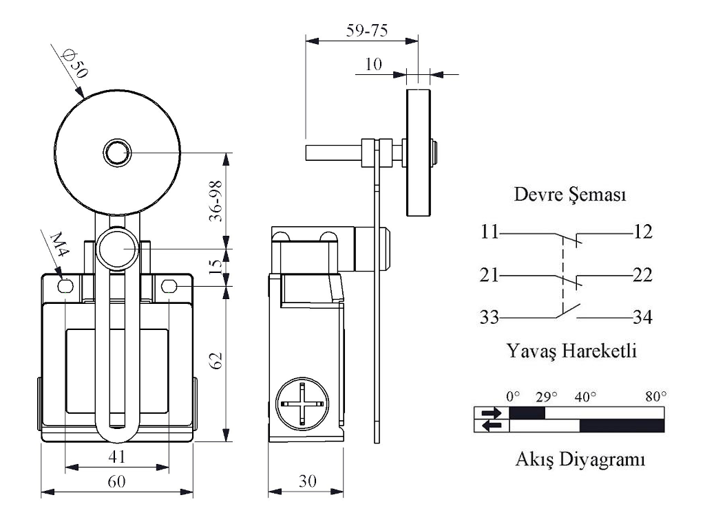 Выключатель концевой синхронного переключения угловой 2-х направленный с металлической консолью и резиновым роликом Ф50мм на длинном регулируемом по наклону рычаге (1НО+2НЗ), L53K25MEL123A