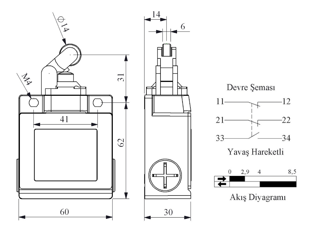 Выключатель концевой синхронного переключения угловой 1-но направленный с металлической консолью и упором с пластиковым роликом Ф14 мм (1НО+2НЗ), L53K25MIP311