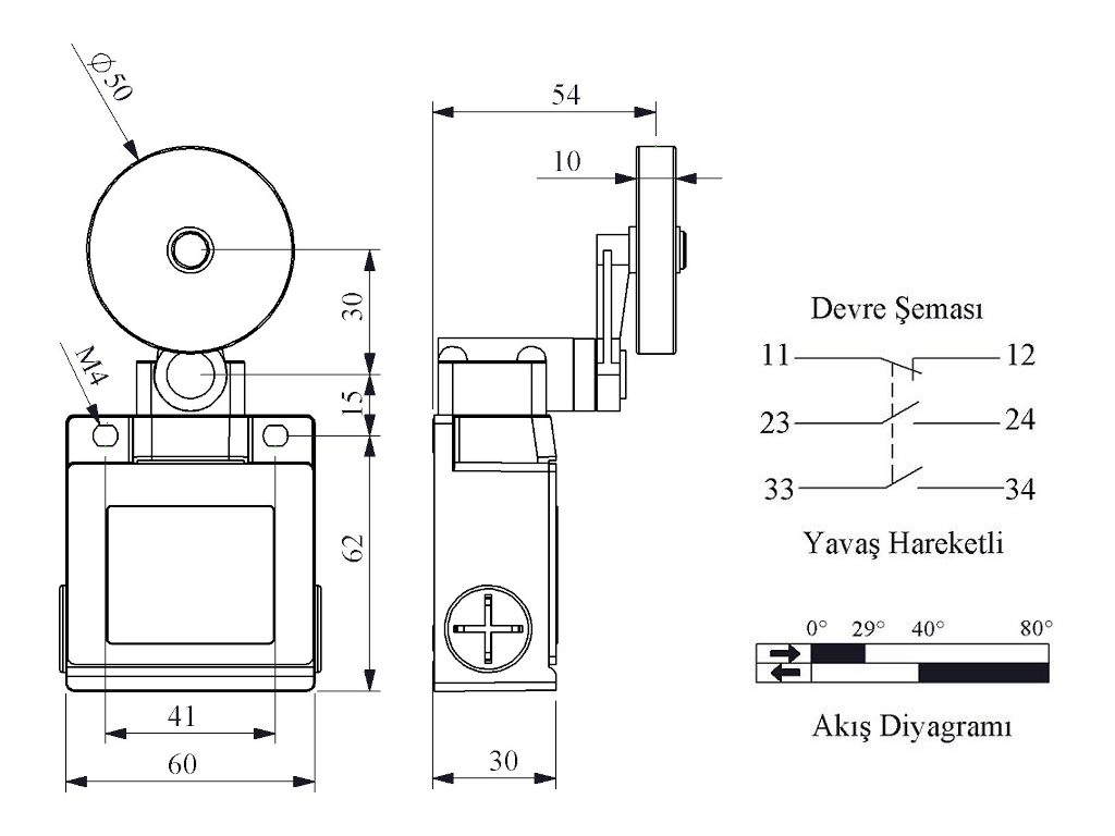 Главная/ Продукция / Концевые выключатели / Серии L53 / Выключатель концевой синхронного переключения угловой 2-х направленный с металлической консолью и резиновым роликом Ф50мм на коротком не регулируемом рычаге (2НО+1НЗ), L53K27MEL121