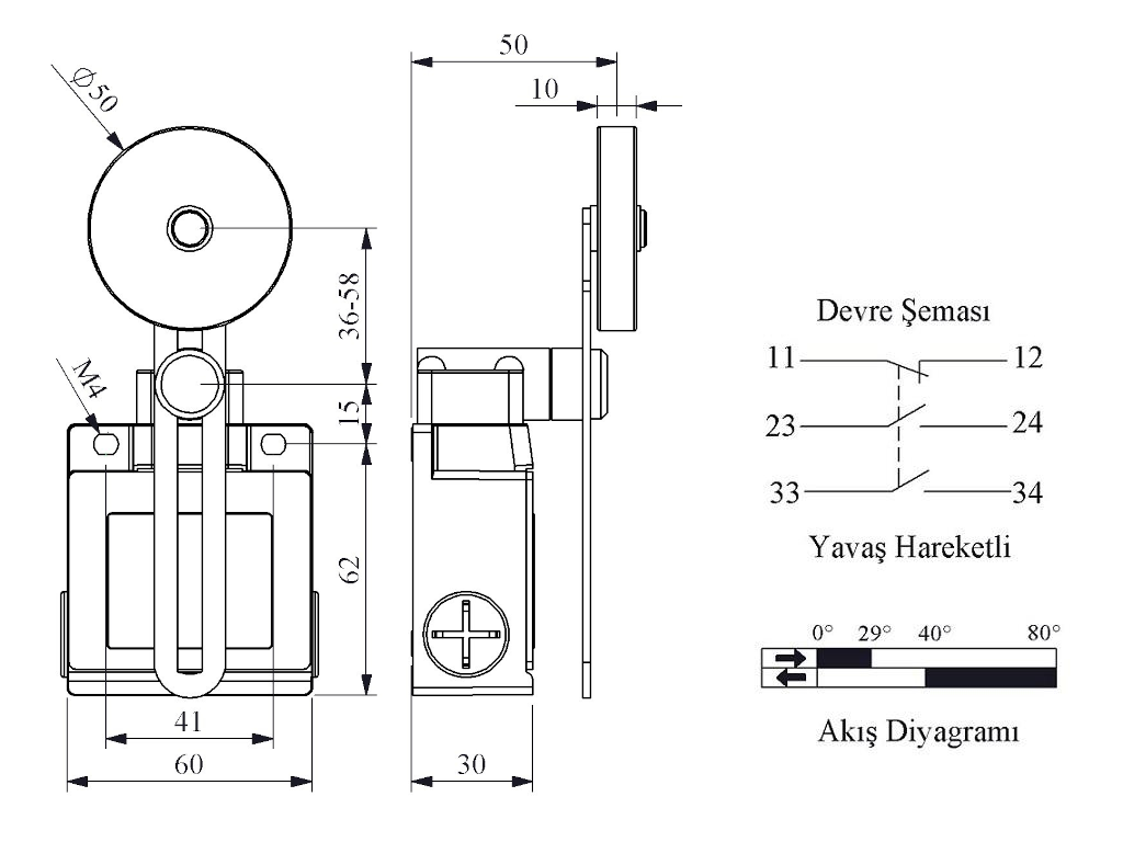 Выключатель концевой синхронного переключения угловой 2-х направленный с металлической консолью и резиновым роликом Ф50мм на длинном регулируемом рычаге (2НО+1НЗ), L53K27MEL123