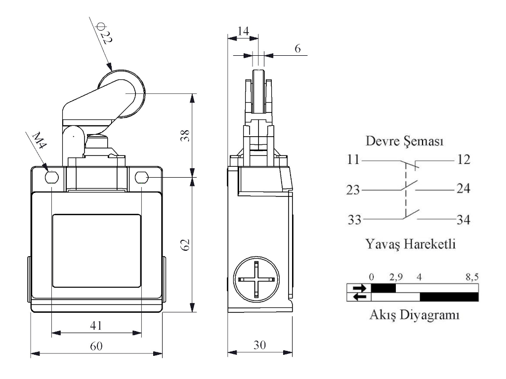 Выключатель концевой синхронного переключения угловой 1-но направленный с металлической консолью и упором с металлическим роликом Ф22 мм (2НО+1НЗ), L53K27MIM211